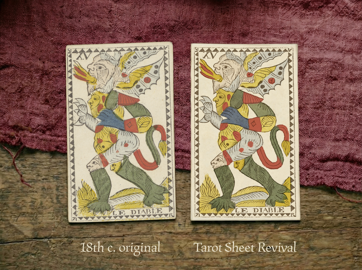 For this edition the entire deck has been carefully redrawn. The linework was reconstructed card by card, while the textures were sampled directly from the original cards. The aim was not to reinterpret the images, but to rebuild them as a coherent whole — allowing the historical deck to exist again as a working pack.