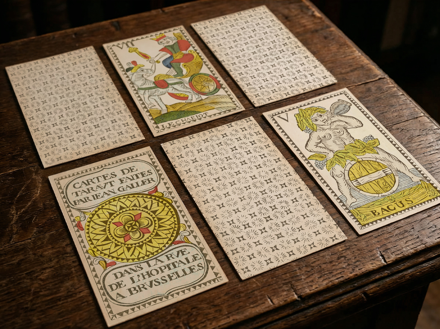 The card backs reproduce one of the original Brussels patterns, alternating radiant suns and four-pointed stars in a repeating field — a striking design rarely encountered in eighteenth-century tarot cards.
